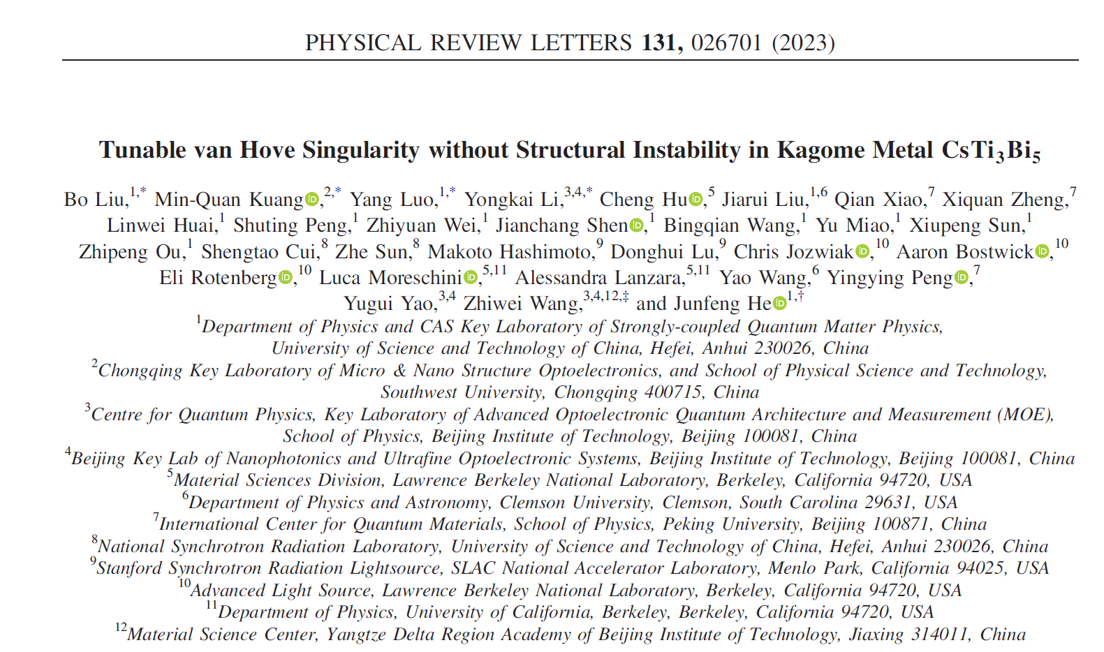 这项工作于2023年7月12日发表在Physical Review Letters上, 题目为“Tunable van Hove Singularity without Structural Instability in Kagome Metal CsTi3Bi5”。 中国科学技术大学本科生刘博、西南大学匡泯泉副教授、中国科学技术大学博士研究生罗洋、北京理工大学博士后李永恺为论文的共同第一作者;中国科学技术大学何俊峰特任教授、北京理工大学王秩伟特别研究员为论文的共同通讯作者。此项工作得到了国家自然科学基金委、科技部、中央高校基本科研业务费专项资金以及中国科学技术大学科研启动经费等资助;得到了斯坦福同步辐射光源、伯克利先进光源以及合肥光源的支持。