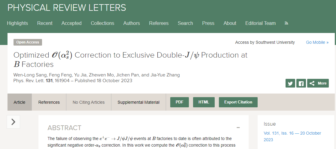 近日欧冠强子物理团队的桑文龙老师与中国矿业大学(北京分校)的冯锋老师、中国科学院高能物理研究所的贾宇研究员以及高能所博士生莫哲文,潘济陈,张佳鈅合作在物理学顶级期刊物理评论快报(Physical Review Letters,简称PRL)上发表题为“Optimized O(αs2) correction to exclusive double J/ψ production at B factories”的科研工作,西南大学为该成果的第一署名单位。该研究工作得到了国家自然科学基金、中德合作基金、重庆市自然科学基金、西南大学先导计划等项目资助。
