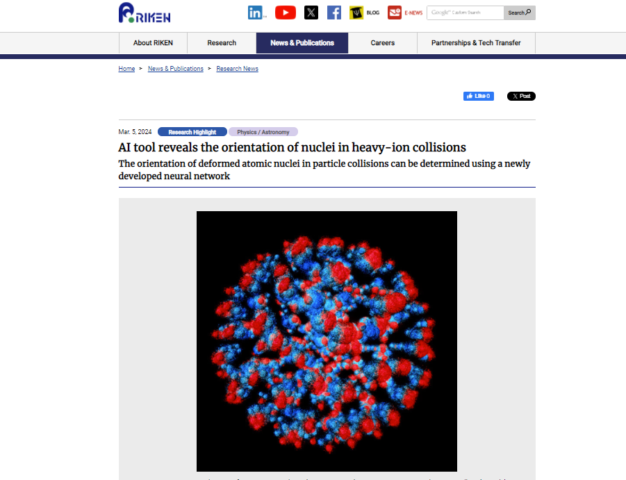 近日,欧冠核物理团队的范小华老师与日本理化学研究所(RIKEN) 仁科加速器科学研究中心合作的最新研究成果“A neural network approach for orienting heavy-ion collision events”在核物理顶级期刊Physics Letters B上发表。日本理化学研究所杨祖星博士为该成果第一作者,西南大学范小华老师为唯一通讯作者,西南大学李志攀教授和日本理化学研究所西村俊二教授为共同作者。研究成果受到日本理化学研究所的高度认可,被评为Research Highlight工作,并重点报道 (https://www.riken.jp/en/news_pubs/research_news/rr/20240305_1/index.html)。该研究工作得到了国家自然科学基金、日本JSPS科学研究基金、RIKEN专项、INT项目、中央高校基本科研业务费等项目资助。