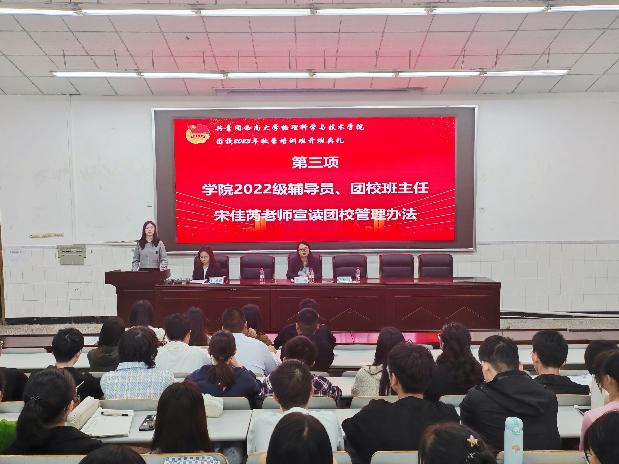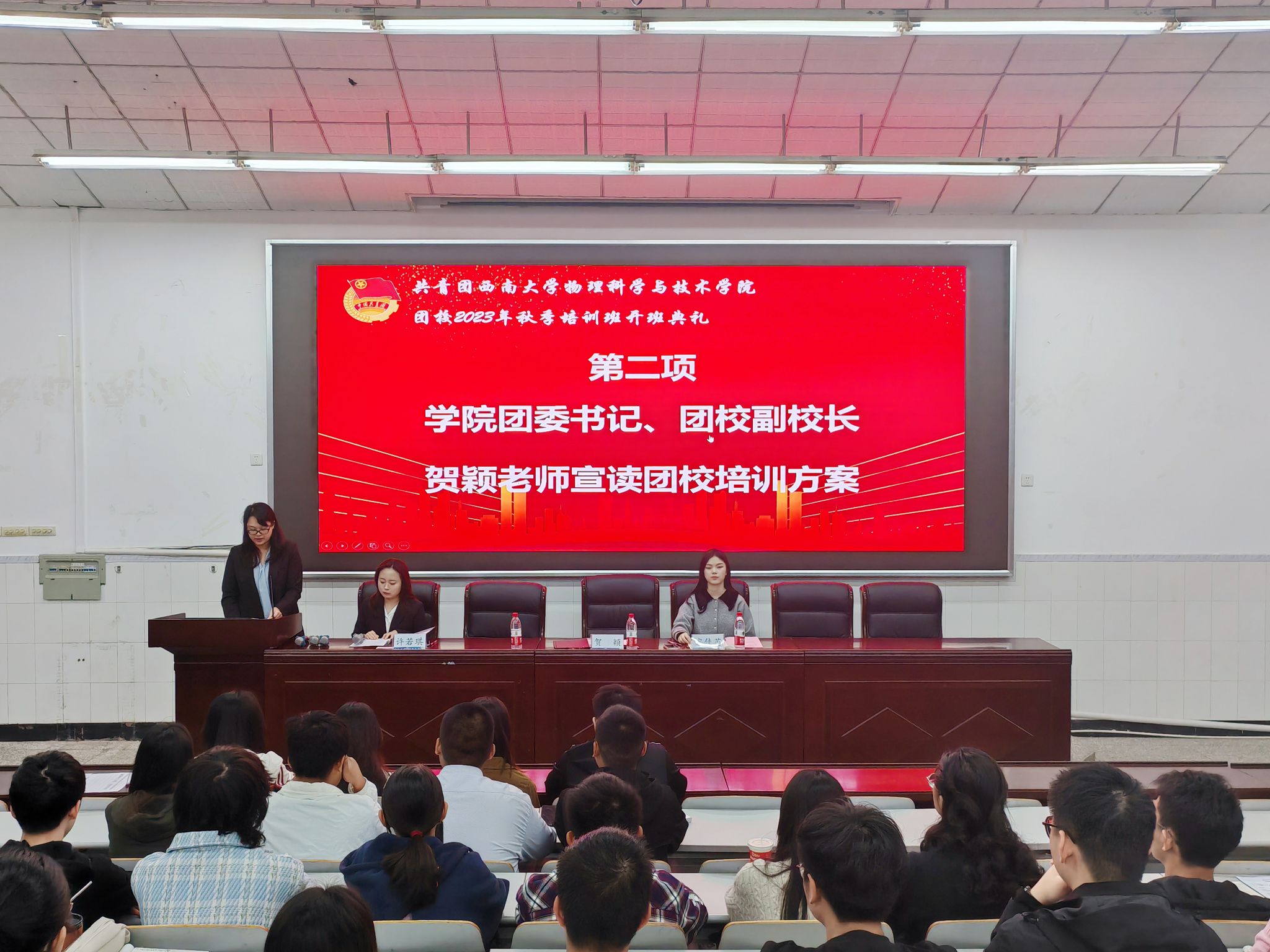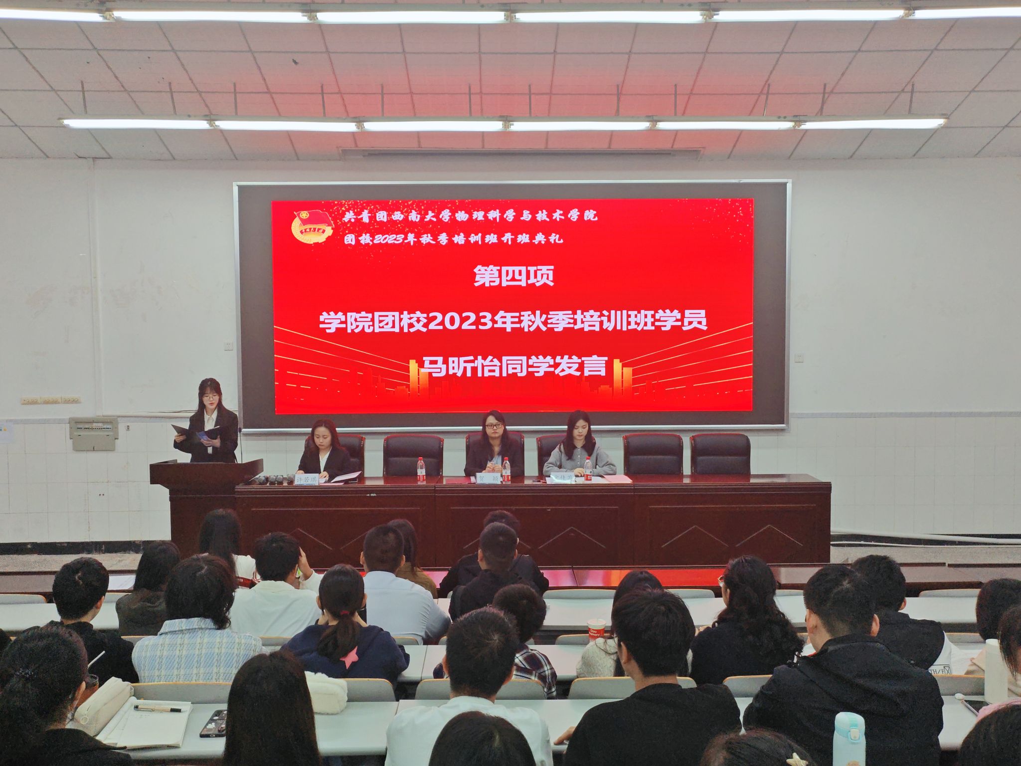 2023年10月22日上午8点30分,团校开班典礼在物理大楼大阶梯教室举行。学院团委书记、团校副校长贺颖,2022级辅导员、团校培训班班主任宋佳芮和100名参训学员参会。典礼由学院团委副书记、团校培训班班长许若琪主持。