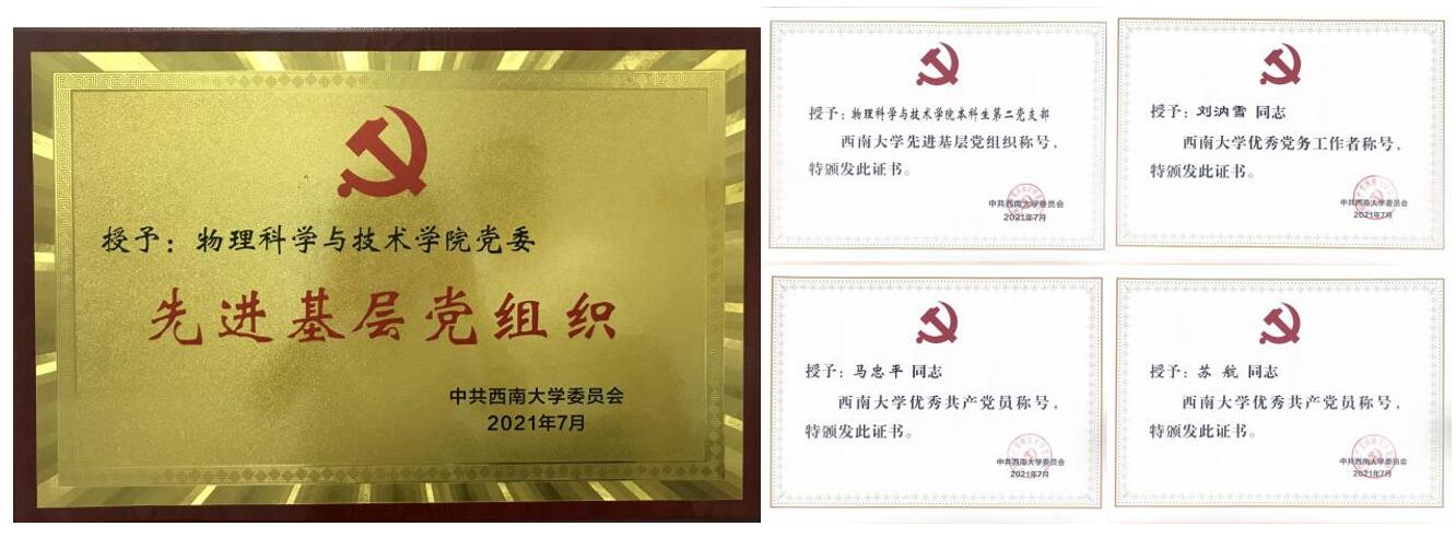 学院在本次“两优一先”的评选中斩获了五项荣誉。学院党委在全校二级党组织中脱颖而出,获得了“西南大学先进基层党组织”荣誉称号。该荣誉称号共授予了校内八个二级党组织,学院党委书记李余廷上台领奖。学院工会主席马忠平副教授以及2018级本科生苏航获得了“优秀共产党员”荣誉称号;党委副书记刘汭雪获得了“优秀党务工作者”荣誉称号;本科生第二党支部获得了“先进基层党组织”荣誉称号。