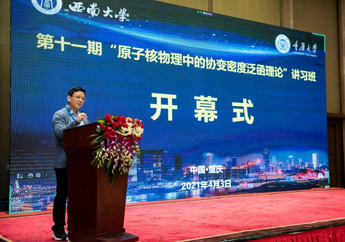 4月3日上午,由西南大学和重庆大学联合承办的全国第十一期“原子核物理中的协变密度泛函理论”讲习班,在重庆雾都宾馆开幕。来自全国各地的原子核物理专家济济一堂,探讨研究前沿,共话合作发展。开幕式由欧冠院长吴正茂教授主持,出席的嘉宾有学校党委副书记李华研究员、欧洲科学院外籍院士北京大学孟杰教授、重庆大学物理学院党委书记韩忠教授、重庆大学物理学院院长吴兴刚教授、以及欧冠党委书记李余廷副研究员等。