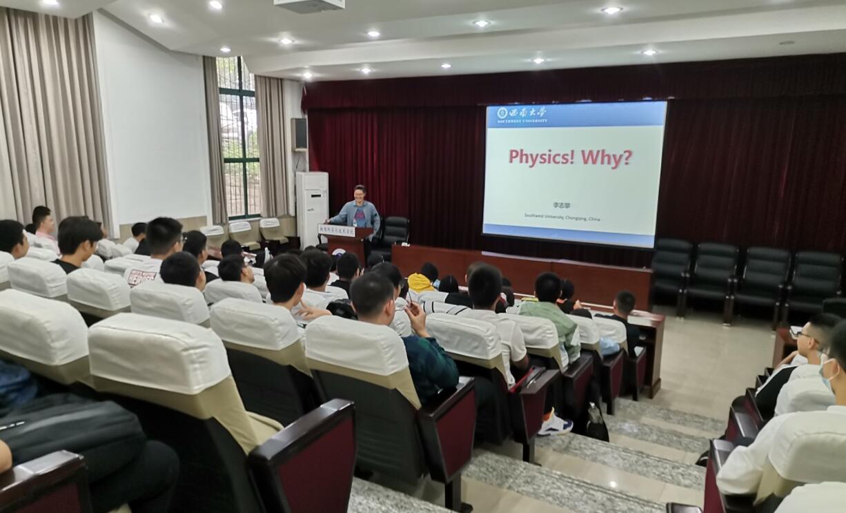下午,“教授下午茶”如约而至,重庆市青年拔尖人才,核物理与天体物理研究中心主任李志攀研究员在小阶梯教室为2020级物理学班的同学带来了一场精彩的讲座。讲座一开始李教授通过介绍个人科研成长经历,引起了同学们的浓厚兴趣;接着,李教授从Science提出的125个科学问题出发,以引力波、“上帝粒子”、中微子振荡、激光物理这几大物理学标志性事件为标志为同学们梳理和介绍了当代物理学的发展历程;随后,李教授又以强流重离子加速器装置、射电望远镜等国家科学大装置吸引着同学们的目光;然后,李教授以物院优秀学子陈启博为例,勉励大家志存高远,方有无悔青春,振奋了物理学班的每一位同学,讲座最后阶段,李教授一一耐心地回答了同学们提出的众多问题。