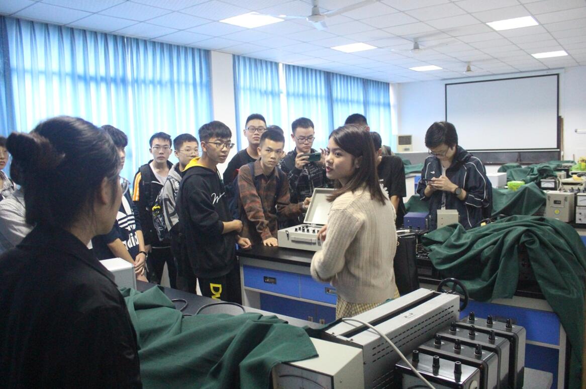下午,全体新生分四组陆续参观了学院实验室。一来到物理实验大楼三楼,大家都表现出了浓厚的兴趣,在高年级学姐学长的引导介绍下,同学们参观了电子束偏转实验室、拉伸法测杨氏模量实验室、落球法测粘滞系数实验室、分光计的调节与使用实验室、电表改装实验室、薄透镜焦距的测定实验室等等,参观过程中,大家都非常兴奋,部分同学听完介绍之后还动手体验操作实验设备。