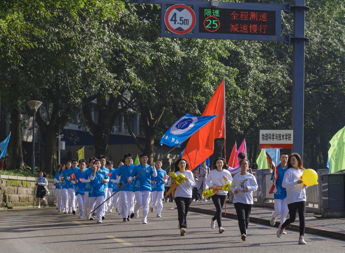10月22日上午,学校第十五届田径运动会在第二运动场隆重开幕。在运动员进行曲激昂澎湃的歌声中,国旗队、校旗队、校徽队等首先入场,紧随其后是由38个学院(部)的一万余名学子组成的学院的代表方阵。物理学院代表队第十八个入场,在党委副书记刘汭雪的带领下,60名学子身着蓝色院服,手持小红旗,迈着铿锵有力的步伐,举出“格物致理,崇德尚善”的院训标牌,喊着“我们是平凡的白光,却蕴含着五彩斑斓的能量”的口号,走到主席台。在主席台下两次变化方阵队形,以独特新颖的方式展示出物理学公式F=ma和E=mc²,吸引了全场的目光。开幕式后的阳光健身跑环节中,在李余廷书记的领跑下,方阵同学们英姿矫健、步伐轻快,完成了1.6公里的校园健身跑路线。