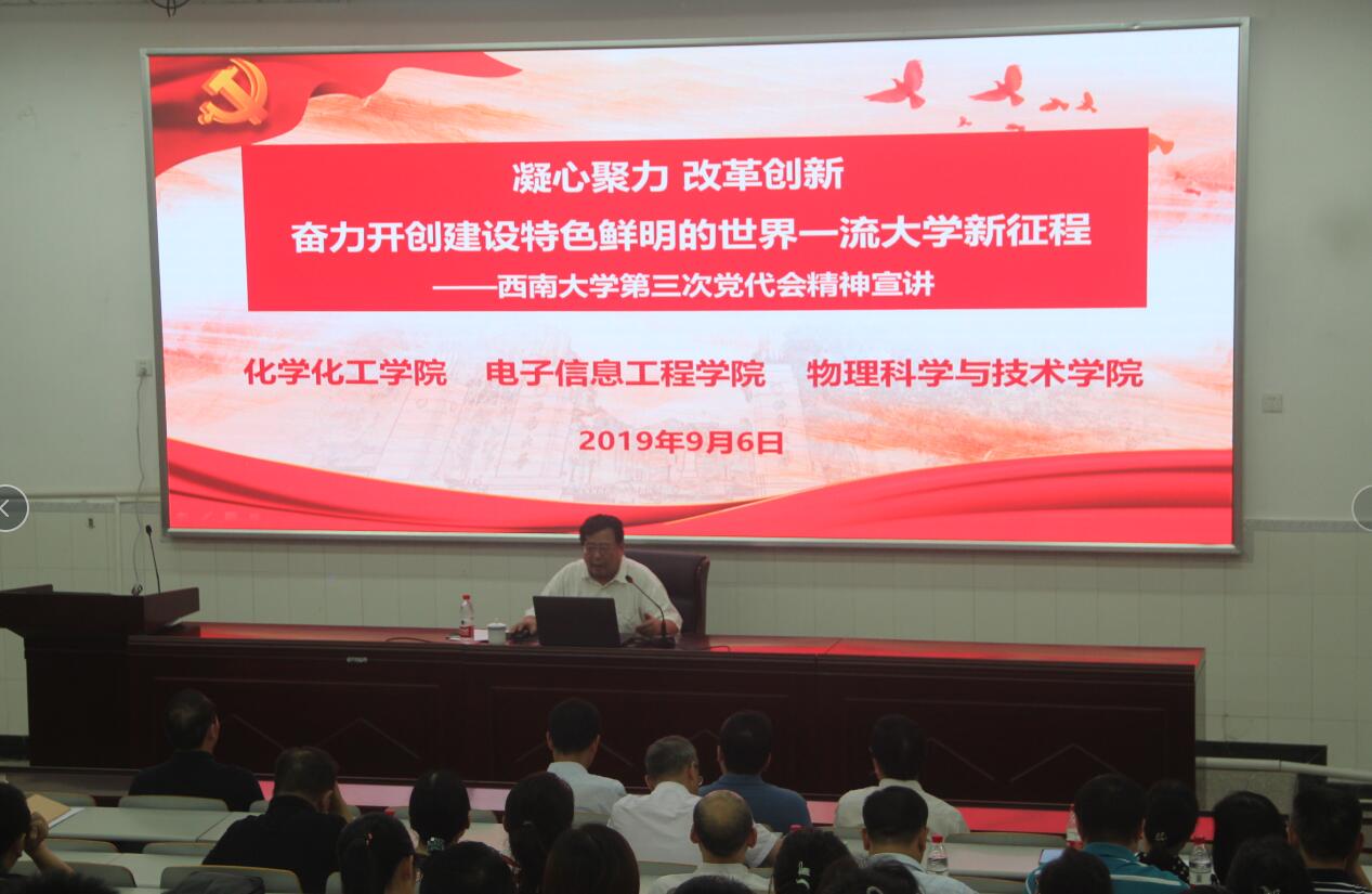 今年7月10-12日,西南大学第三次党代会胜利召开。9月6日下午,根据学校党委关于学习宣传贯彻第三次党代会精神的统一部署,学校宣讲团成员、党委常委、副校长崔延强教授来到欧冠,就全面学习宣传贯彻学校第三次党代会精神作专题宣讲。来自化学化工学院、电子信息工程学院和欧冠官方网站入口200余名教职工参加了宣讲报告会。报告会由学院党委书记李建光主持。