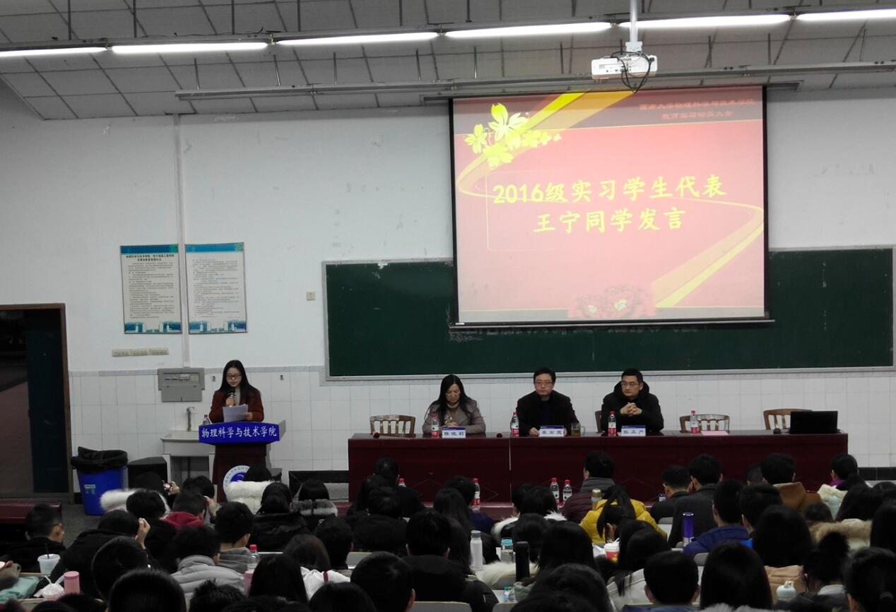 1月15日上午,2019年本科生实习动员大会在学院大阶梯教室举行。副院长袁宏宽教授、院长助理张正严副教授、物理教育教研室副主任陈晓莉副教授,实习指导教师马忠平、李太华、蒋小平、邓磊、陈历相、年级辅导员唐昊坤出席动员会,2016级全体公费师范生参会。