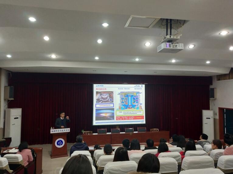 11月30上午9:30,报告准时开始,报告会由李志攀教授主持,来自全校近百名师生参加了报告会。在报告中,葛智刚研究员从核数据的基础研究入手,依次介绍了原子核的基本特性、元素周期表与核素图、核的放射性、核衰变、核的稳定性以及核反应的基本原理等,使同学们对核有了正确的认识。接着列举了大量的生活实例引出了核的特性应用,包括国家安全、能源、核基础研究、核技术应用的介绍,突出了核数据研究的重要性,让同学们体会到核就在我们身边,葛智刚研究员提醒同学们,不要害怕核,但也不能轻视。