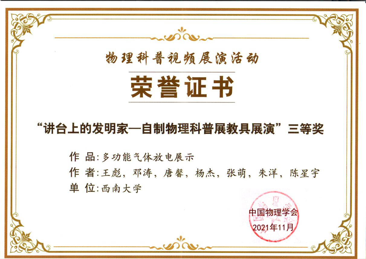 2021年12月17日,欧冠官方网站入口的三支小队在2021年全国物理科普大会“物理科普展演”中表现出色,取得优异成绩。在“科学三分钟——物理科普讲解视频展演活动”中分别获得二等奖、优秀奖,在“讲台上的发明家——自制物理科普展教具展演活动”中获得三等奖。