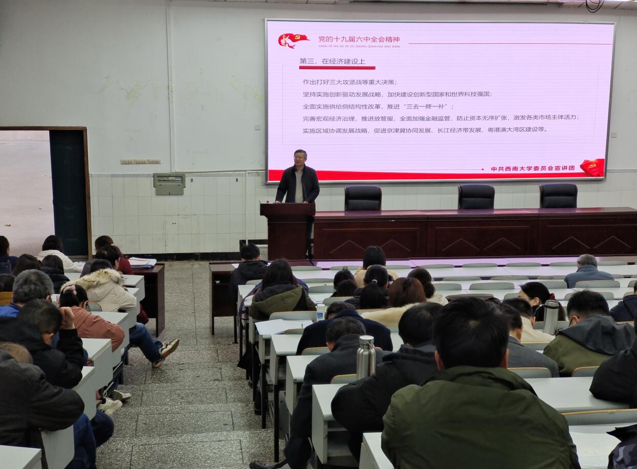 根据学校党委统一部署,12月17日下午,学校党的十九届六中全会精神宣讲团成员、学校党委统战部常务副部长周文全同志为学院全体教职工开展了党的十九届六中全会精神宣讲。宣讲会由学院党委书记李余廷主持。