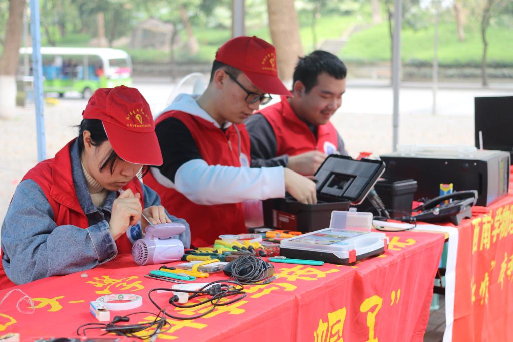 万用表,电烙铁,螺丝刀,剥线器,胶枪,热熔胶……,欧冠官方网站入口学生向爱玲带着一大包工具,来到了学校北区樟树林,与“红帽子”青年志愿者服务队的小伙伴汇合后,开始摆摊迎接前来维修家电的师生。
