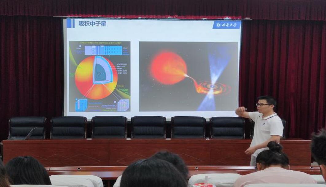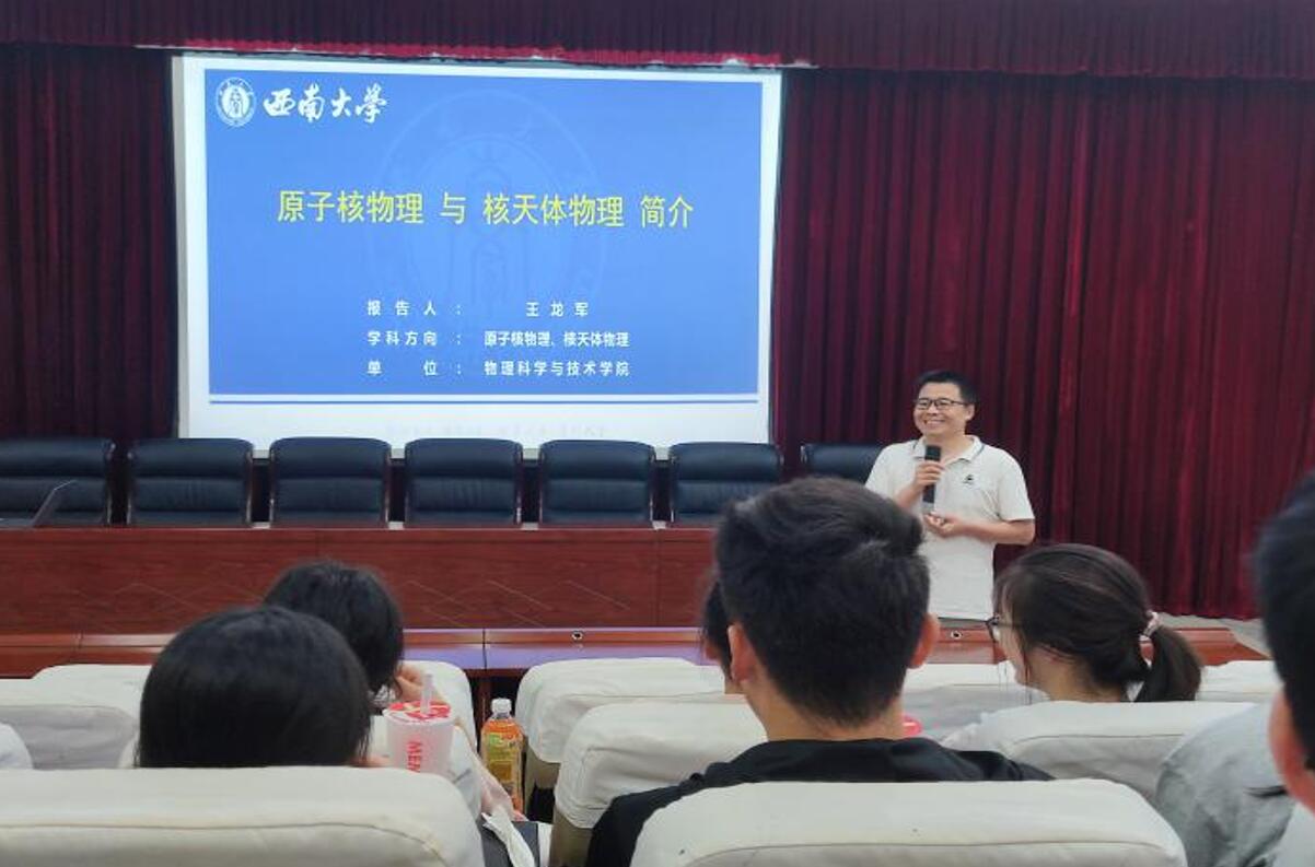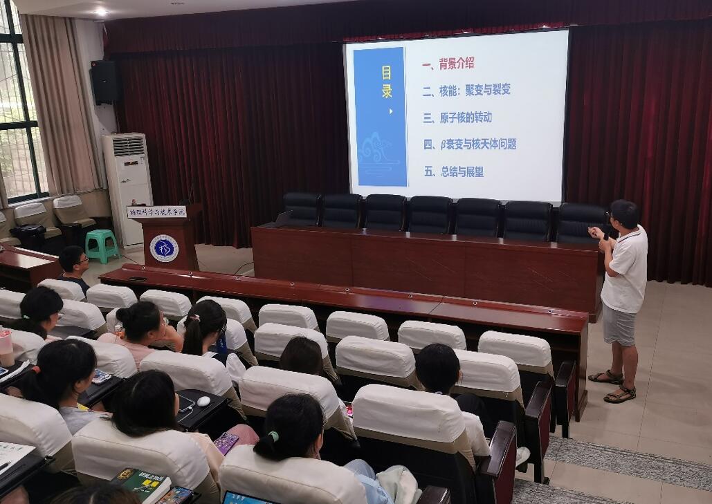 6月8日,第十二期悟理论坛在物理大楼小阶梯教室举行,2021级物理学2班承办此次论坛。本期论坛的主题是“原子核物理与核天体物理简介”,王龙军副教授应邀担任主讲嘉宾,副院长桑文龙、学院团委书记贺颖老师参会。