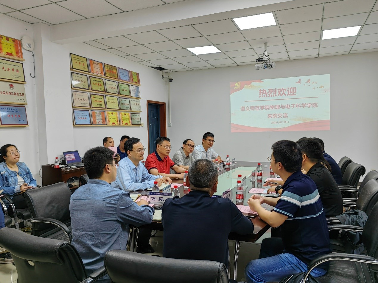 2023年6月16日下午,遵义师范学院物理与电子科学学院吴英书记、金星院长一行十六人莅临学院交流座谈。学院党委书记李余廷、副院长邓涛、副院长赵建伟、副院长桑文龙及教师代表参加了座谈。学院党委李余廷书记主持座谈会,对吴英书记、金星院长一行的到来表示热烈欢迎。