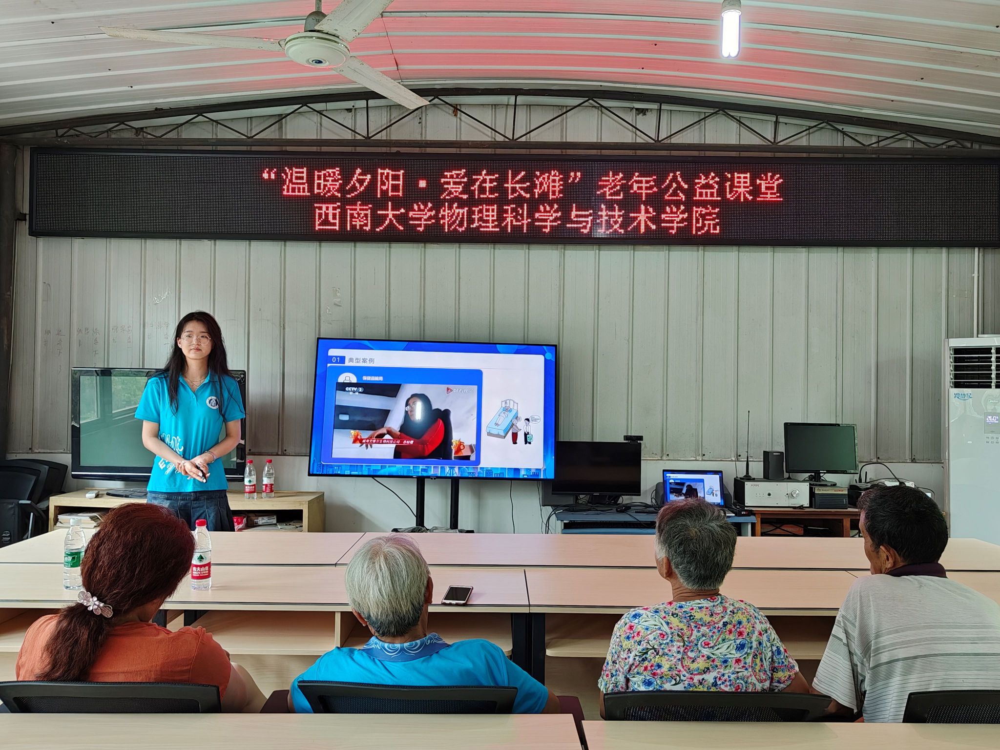 “3、2、1,升空!”7月4日上午在长滩村村委会的院坝里,小朋友们在西南大学科普空间站大哥哥、大姐姐们的指导下装水、加压、发射。竭尽全力地打足气后,水火箭“嘭”的一声升空的那一刹那,小朋友们都欢呼雀跃。7月4日下午在燎原社区会议室里,“怎样折纸飞机才能飞得更远呢?”“下雨天比雷声更早出现的是什么呢?”实践团的小老师们继续为小朋友们带来生动有趣的暑期嘉年华活动。与此同时,针对长滩村居住分散、留守老人多的特点,实践团的成员们积极参与老年健康教育服务,精心准备了两期“温暖夕阳 爱在长滩”老年公益课堂。围绕健康养生、自救自护、防范电信诈骗等主题,以图文并茂、寓教于乐的形式进行了常见疾病的自我管理教育和医保相关政策宣讲。