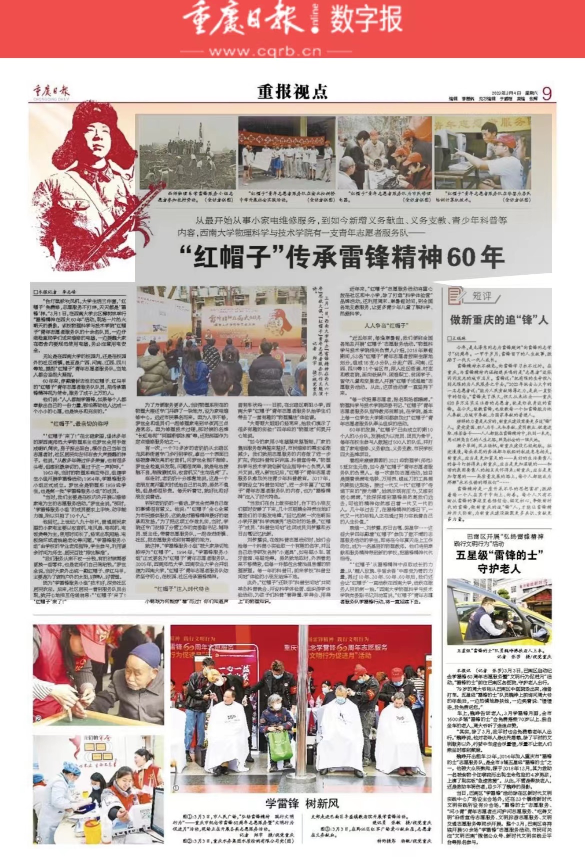 2023年3月1日,西南大学组织召开了“雷锋精神在西大60年”思政大课,学院“红帽子”志愿服务队作为校内连续不间断传承雷锋精神的志愿组织之一,在北区樟树林维修家电、分享红帽子60年传承的故事和精神理念,获得了人民日报、光明日报、华龙网、学习强国等媒体的关注、报道和转载。