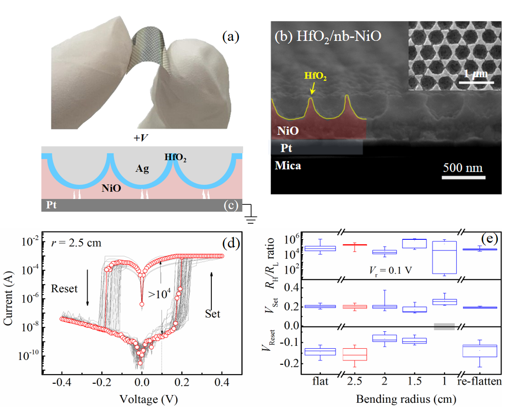 柔性电阻随机存储器(RRAM)结构简单,适用于可穿戴的电子设备、仿生元件和人形智能机器人。全柔性有机RRAM器件具有很好的柔韧性,但是热稳定性和耐受性远不及传统无机RRAM器件;而全无机RRAM器件的塑性又有限。在该工作中,团队成员与赵建伟教授课题组合作,采用单层胶体球自组装模板结合电化学沉积和磁控溅射方法在覆盖Pt导电层的白云母衬底上制备了NiO纳米碗状阵列(Nano-bowl-like NiO Array, nb-NiO)。该纳米序构阵列有效增大了电阻翻转层与电极的接触面积,同时诱导导电细丝空间分布呈现局域有序性,从而将器件翻转电压降低到< 0.4 V。该纳米序构阵列还及时释放了器件弯曲产生的拉伸或压缩应力,提升了器件的拉伸抗性。在2.5 cm弯曲半径下,器件经过1500次连续循环测试后,仍保持>1000的高/低电阻值比,显示出良好的柔韧性和耐受性。该研究为设计制备新一代低功耗柔性存储器提供了新的研究思路。