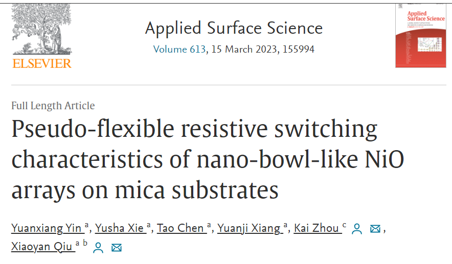 近日,欧冠光电存储器件物理与材料计算团队邱晓燕教授课题组在伪柔性纳米序构阵列存储器件研究取得重要进展。相关成果以题为“Pseudo-flexible resistive switching characteristics of nano-bowl-like NiO arrays on mica substrates”在应用物理领域国际重要学术期刊《Applied Surface Science》(中科院分区材料科学一区Top期刊)上发表。欧冠硕士研究生殷元祥为该论文的第一作者;邱晓燕教授为通讯作者,重庆大学测试中心周楷工程师为共同通讯作者;欧冠官方网站入口(微纳结构光电子学重庆市重点实验室)为第一完成单位。