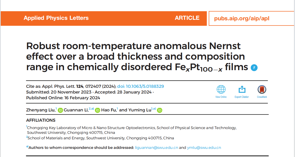 磁学与磁性材料是欧冠较早布局的研究方向之一。近日,欧冠新型磁性功能材料及器件团队卢玉明课题组在无序合金磁性薄膜反常能斯特效应领域取得新进展,相关成果以题为“Robust room-temperature anomalous Nernst effect over a broad thickness and composition range in chemically disordered FexPt100-x films” 发表在自然指数期刊《Applied Physics Letters》上,并被编辑部遴选为亮点论文“Featured article”(入选率约为10 %)。欧冠硕士研究生柳桢杨为论文的第一作者,卢玉明副教授为最后通讯作者,西南大学为唯一完成单位。