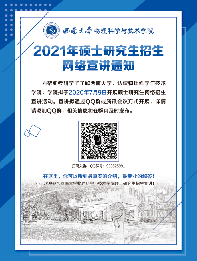 为帮助考研学子了解西南大学,认识欧冠官方网站入口,学院拟于2020年7月9日开展硕士研究生网络招生宣讲活动。宣讲拟通过QQ群或腾讯会议方式开展,详情请添加QQ群,相关信息将在群内及时发布。 QQ群:963525991 在这里,你可以听到最真实的介绍,最专业的解答!