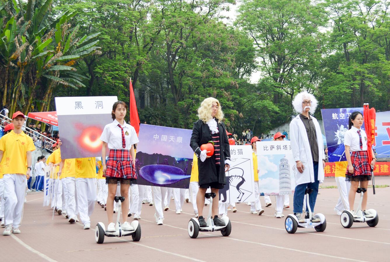 4月18日上午,学校第十四届田径运动会在第二运动场开幕。开幕式上,伴随着激扬的进行曲, 60名学子身着明黄色院服,手持星形气球,迈着铿锵有力的步伐作为第一个学院方阵率先入场。方阵前排学生化身为“爱因斯坦”“牛顿”,脚踏平衡车,徐徐走近主席台,紧跟在他们身后的一排印有“中国天眼”“航空卫星”“黑洞” “薛定谔的猫”等物理科学发现发明的图片。走过主席台时,方阵举出“格物致理,崇德尚善”的院训标牌,齐声喊出 “格物致理,自强不息,兴我物院,永争第一”的口号,展示的横幅“奋斗的青春没有黑洞”充分展示了他们的青春态度和顽强拼搏的信念决心。