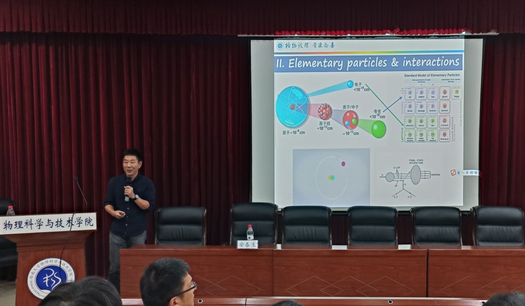 随后,安教授讲解了基本粒子及其之间的相互作用,从人们对“构成世界的基本粒子”的认知过程切入,由原子、原子核、质子和中子逐步深入到夸克,并最终引出夸克的束缚态强子。他梳理了强子物理理论的发展历史和研究现状,从四种基本相互作用到粒子物理标准模型,从对撞机实验装置到世界八大高能实验物理研究中心,从小到大、从广入微,使同学们对强子物理理论有了更全面深入的了解。