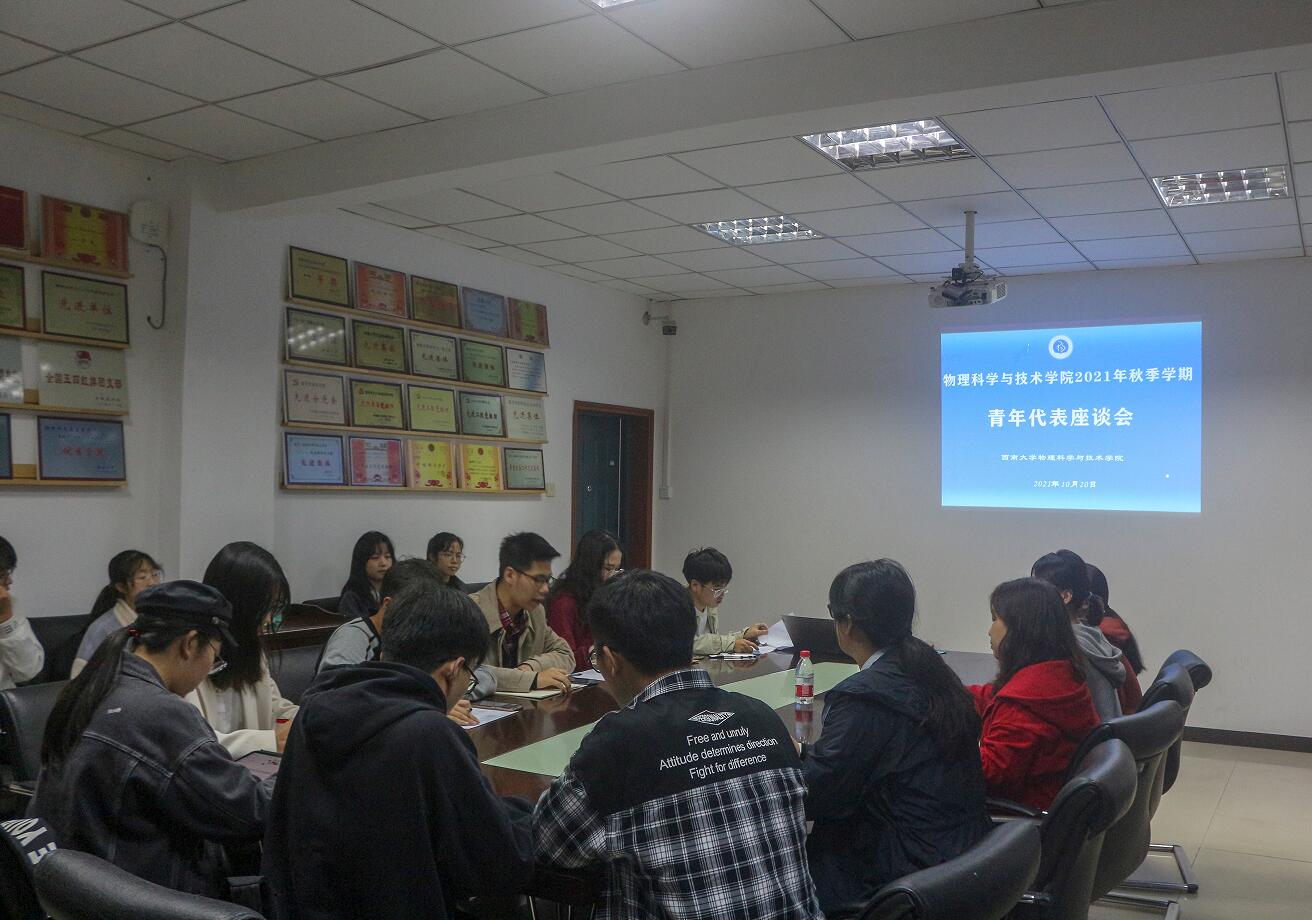 为进一步调研学院青年学生的发展需求,有针对性的开展思想政治教育工作, 10月20日下午,学院在物理大楼二楼会议室召开2021年秋季学期青年学生代表座谈会。学院党委副书记刘汭雪、团委书记贺颖、2020级辅导员晏勇出席,团委学生会、科普社、党员先锋队的学生骨干,校第六次学代会学院参会代表以及低年级学生代表共计30人参会。