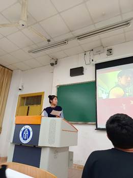 最后的环节是以“请党放心,强国有我”为主题的演讲分享。两位同学上台讲出了她们自己的爱国情,唤起了同学们的爱国情,喊出了青少年对祖国的保证——请党放心,强国有我!甘佳莉同学会后分享道:“这次团日活动让同学们更深切地体会到了习近平总书记`未来属于青年,希望寄予青年’的殷切厚望,了解到了更多优秀的青年榜样,并从他们的身上汲取力量。相信在未来的日子里,我们一定能砥砺前行,勇担时代重任!”